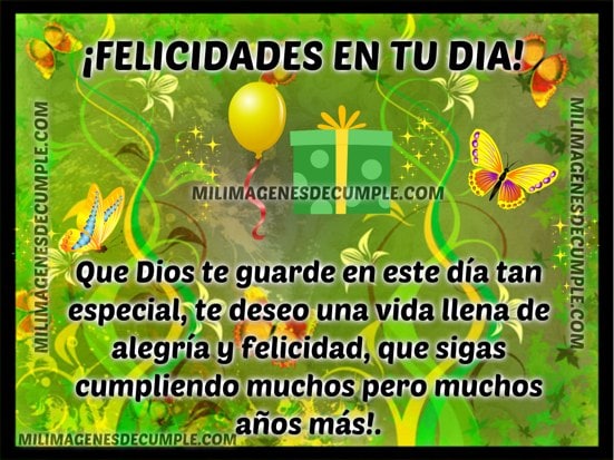 Más modelos de imágenes de cumple muy bonitas, con diferentes diseños, dibujos y frases, ideales para saludar a los cumpleañeros cualquier sea el vínculo que los una!. Para hoy diseñamos una imagen en un fondo verde, rodeado de mariposa de colores, globo en tono amarillo y un regalo de cumple en tono verde y amarillo. Esta imagen no solo es linda, sino que contiene una frase cristiana preciosa, que podrás dedicar a quien más quieras en su cumpleaños. Descarga la misma a la PC, Celular o Móvil y compártela en las redes sociales de tu preferencia.