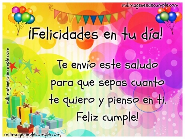¡Felicidades en tu día! Te envío este saludo para que sepas cuanto te quiero y pienso en ti. Feliz cumple!.