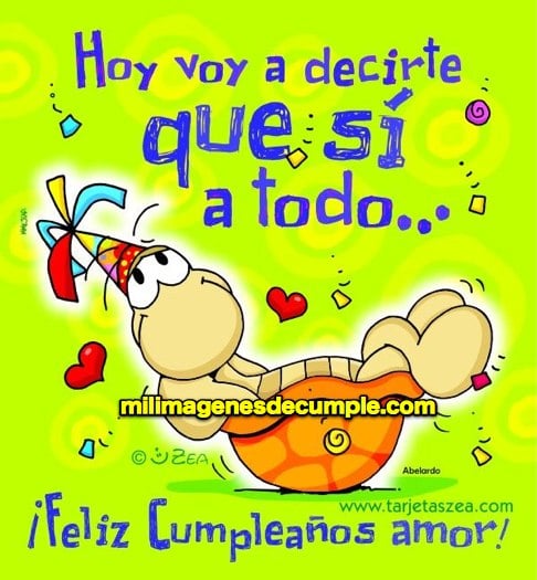 Tierna y divertida imagen de cumpleaños para dedicar a tu pareja, novio o novia con la siguiente frase "Hoy voy a decirte que si a todo... feliz cumpleaños amor!". Para usarla, descárgala y súbela en el muro de face!.