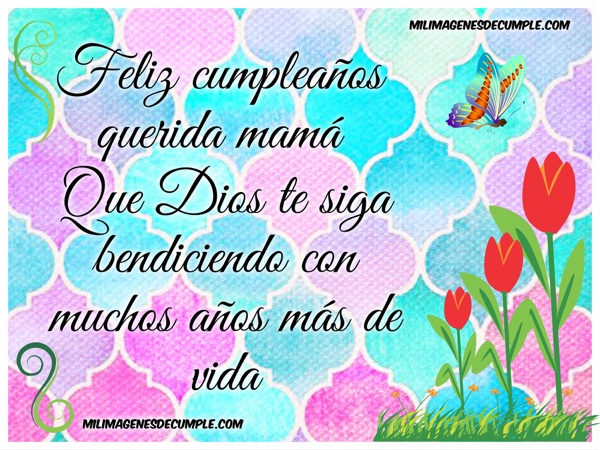 Cuando mamá cumple años debemos celebrarlo con todo el amor del mundo, que sienta en su corazón cuanto la apreciamos y queremos. Para que todos puedan saludar a su querida madre en su día de cumpleaños les dejamos esta bella imagen para obsequiar a mamá, tiene tulipanes y mariposas como adornos y la siguiente frase: