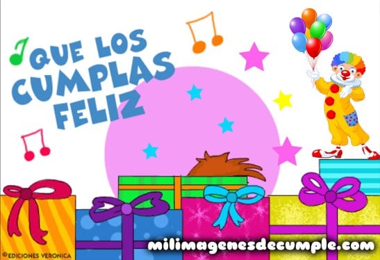 Aprovechamos para dejarles este nuevo modelo de imágenes de cumpleaños de colores, la cual tiene un diseño muy divertido que ya verán más abajo. Es una imagen donde hay muchos regalos de colores, un payaso sosteniendo un ramo de globos, y una frase que dice "Que los cumplas feliz". Si les gustó los invitamos a que la descarguen de manera gratuita y que la usen como más les guste. Pueden regalársela personalmente a la persona que cumple años o bien subirla a Facebook y etiquetarla.