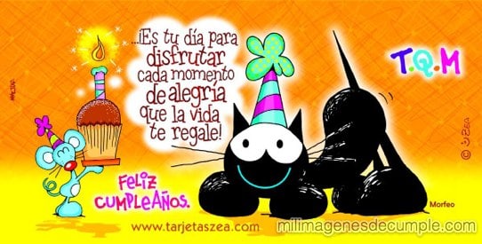 Las imágenes de cumpleaños con dibujitos son una forma muy divertida de transmitirle nuestros buenos deseos a los amigos y familiares que estén cumpliendo años, por eso les queremos dejar este nuevo modelo de imágenes de feliz cumpleaños gratis, la cual tiene un diseño muy divertido con un ratoncito y un gato al cual le están festejando el cumpleaños. Aparte de eso también tiene una frase que dice: "Es tu día para disfrutar cada momento de alegría que la vida te regale. Feliz cumpleaños".