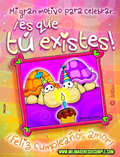 En esta ocasión les queremos dejar un nuevo modelo de imágenes de cumpleñaos para regalar a su pareja, la cual tiene dos tirtuguitas enamoradas soplando unas velas y una frase que dice: ¡Mi gran motivo para celebrar es que tú existes! ¡Feliz cumpleaños amor! Esperamos que esta nueva imagen de cumpleaños para novios les haya gustado y que la descarguen a su PC para regalársela a la persona que aman y darle una hermosa sorpresa.