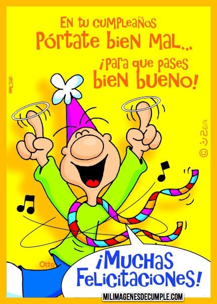 Aprovechamos para dejarles un nuevo modelo de imágenes de feliz cumpleaños con frases, en la cual hay un muñequito muy feliz festejando y una frase que dice: "En tu cumpleaños pórtate bien mal... para que pases bien bueno! Muchas felicitaciones!". Esperamos que este modelo de imágenes de cumpleaños les haya gustado y que lo descarguen a su PC para regalárselo a quien quieran.