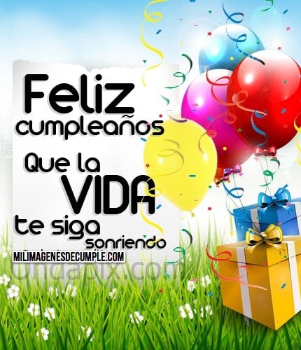 Les queremos dejar este nuevo modelo de imágenes de cumpleaños para que descarguen y le regalen a sus seres queridos y amigos. Como pueden ver, el diseño de la imagen es uy alegre con globos de colores, unas cajas envueltas para regalo y una frase que dice lo siguiente: "Feliz cumpleaños. Que la vida te siga sonriendo".