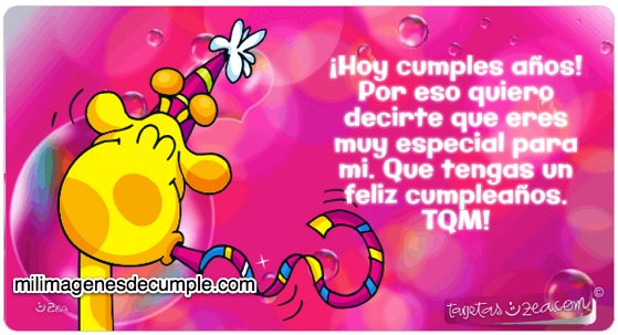 "¡Hoy cumples años! Por eso quiero decirte que eres muy especial para mi. Que tengas un feliz cumpleaños. TQM!" Esa es la frase que tiene la imagen de cumpleaños que les queremos dejar a continuación. Seguramente les va a gustar porque tiene un diseño muy divertido con una jirafita que está festejando.
