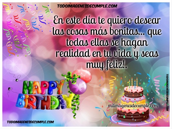 A continuación les dejamos las tarjetas de cumple o imágenes de cumple con las frases, el fondo verán que es siempre el mismo! mucho color confeti, una torta de cumpleaños y la frase Happy Birthday (significa feliz cumpleaños en idioma inglés). Descarga la que más te guste o se adapte a tus requerimientos o relación y obséquiala a través de las redes sociales como Facebook, Instagram, WhatsApp, etc: